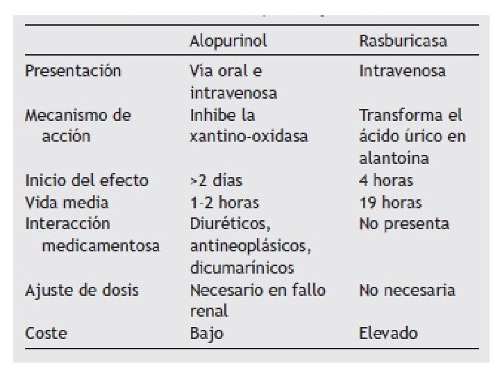 Abordaje de Hiperuricemia • Urato Oxidasa (Rasburicase): • Enzima que cataliza la oxidación de ácido úrico a alantoína. • Disminuye 2, 5 mg de ácido úrico en 4 h. • Contraindicado en déficit de la enzima glucosa-6 -fosfato deshidrogenasa. • Efectos adversos: anafilaxia, erupción cutáneo, hemólisis, fiebre, neutropenia, dificultad respiratoria. • Recomendada en pacientes con ácido úrico >8 mg/ml. • Dosis: Ø Vía endovenosa: - 0, 05 -0, 2 mg/kg a pasar en 30 minutos, durante 1 -5 días.
