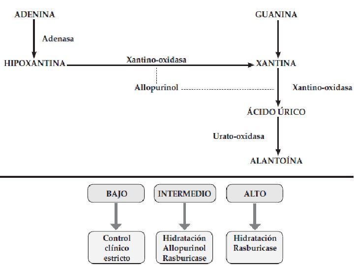 Abordaje de Hiperuricemia • Allopurinol: • Es un inhibidor competitivo de la xantino oxidasa. • Disminuye la formación de acido úrico y reduce el riesgo de uropatía obstructiva. • Aumenta las concentraciones de xantina e hipoxantina. • Efectos adversos: erupción cutánea, hepatotoxicidad, hipereosinofilia. • Debe iniciarse 12 -24 h antes de comenzar la quimioterapia y mantenerse por 3 -7 días (según evolución y resultados de laboratorio) hasta la normalización de los valores de acido úrico y glóbulos blancos. • Dosis: Ø Vía oral: Dos esquemas terapéuticos posibles: - 100 mg/m 2/dosis, 3 veces por día. - 5 -10 mg/kg/día dividido en 3 dosis diarias (máximo 800 mg/día). Ø Vía endovenosa: - 200 -400 mg/m 2/día en 1 -3 dosis diarias (máximo 600 mg/día).