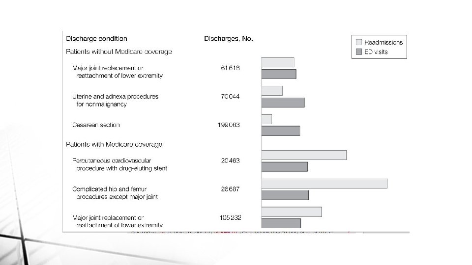 From: Use of Hospital-Based Acute Care Among Patients Recently Discharged From the Hospital JAMA. 2013; 309(4): 364 -371. doi: 10. 1001/jama. 2012. 216219 Figure Legend: The analysis was conducted on the 3 highest-volume medical conditions for both groups. ED indicates emergency department. Date of download: 2/23/2013 Copyright © 2012 American Medical Association. All rights reserved.