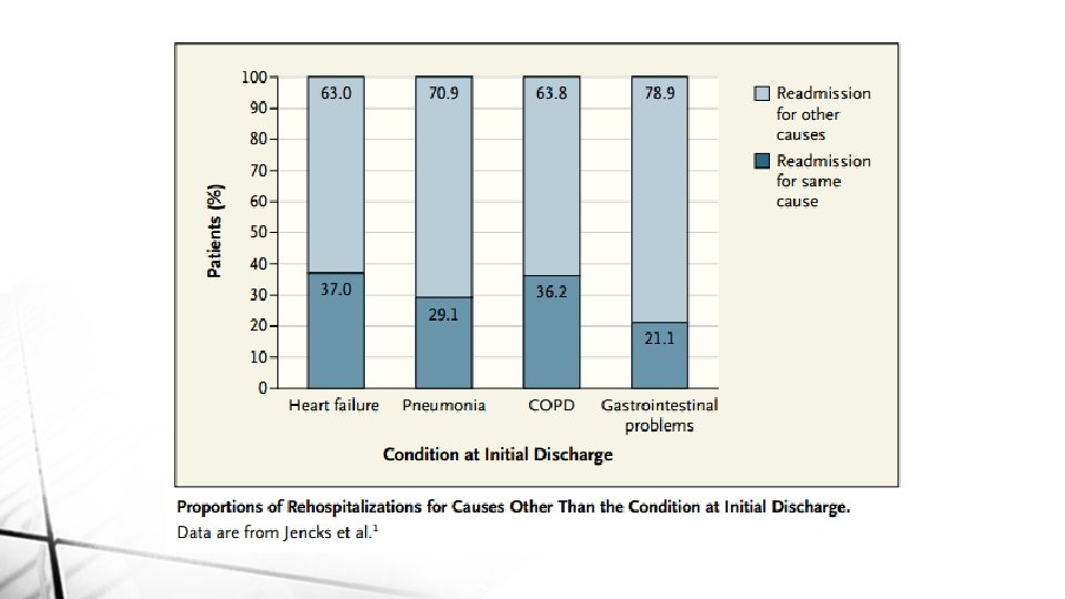 Causas de readmisión • Insuficiencia cardiaca • Neumonía • Enfermedades gastrointestinales • Enfermedades mentales • Trastorno metabólicos • Traumatismo n engl j med 368; 2 nejm. org january 10, 2013