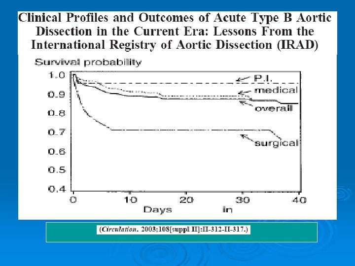 Disección de Aorta Tipo B Ø Mortalidad 10% a los 30 días, si no se complica. Ø Los complicados (IRA, isquemia visceral, rotura contenida) la mortalidad 20% al 2º día y 25% a los 30 días.