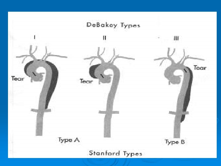 Disección de Aorta Ø Clasificación de Stanford. Ø Tipo “A”. Ø Tipo “B”. Ø Clasificación de de Bakey. Ø Tipo I: Afecta la Aorta en su totalidad. Ø Tipo II: Afecta solo la aorta ascendente. Ø Tipo III: Afecta la aorta descendente.