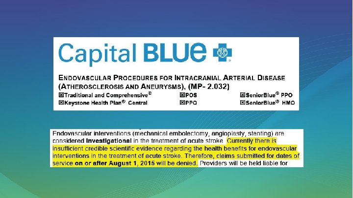 Endovascular Embolectomy • For patients with anterior circulation stroke and ELVO affecting ICA or M 1 with corresponding clinical deficit(s), the addition of endovascular embolectomy results in superior clinical outcomes compared with best medical therapy alone. – Embolectomy must be performed as rapidly as possible for greatest clinical benefit – Best performed within 6 hours of stroke onset • AHA Class I, LOE A Jayaraman MV. J Neuro. Intervent Surg 7: 316 -21, 2015