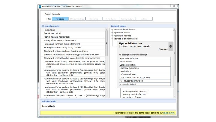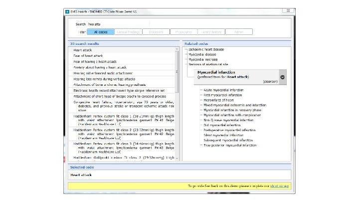 Expressing a search We can express a search in two ways: Use ECL and the hierarchy structure : Concept and all of its descendants <<233838001 | Acute posterior myocardial infarction (disorder) | Cherry pick the codes (cluster list): List each concept seperately 233838001 | Acute posterior myocardial infarction (disorder) | 70998009 | Acute myocardial infarction of posterobasal wall (disorder) | 15713201000119105 | Acute ST segment elevation myocardial infarction of posterobasal wall (disorder) | Although these produce the same result, that may only be true for a particular release. We’ll see that using the hierarchy is a better way to write the searches when we can. 31