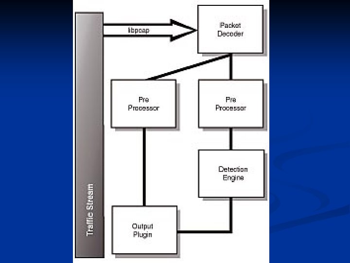 Components in Snort External packet – capture library n Packet decoder – translates protocol elements into an internal data structure n Preprocessors – examine/manipulate packets for detection engine n Detection engine – tests single elements of packets n Output plugins – generates alerts n