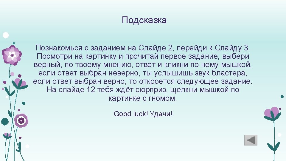 Snow White Quiz Nadezhda Skorova Look at the Slides: 13 Download presentation Snow White Quiz Nadezhda Skorova Look at the picture, read the task and choose the correct variant. Good luck! There are many animals … the picture. А) in B) on C) at How many squirrels are there? А) One В) Three C) Two The two birds are … branch of the tree. А) near one B) in one C) on one The rabbit has a small white …. А) ear B) tail C) nose There are many … in the forest. А) flowers B) berries C) mushrooms What is Snow White like? She …. А) is blond B) is kind C) like animals What are they not doing? They are …. А) walking B) standing C) sleeping Which animal mustn’t be in this picture? А) a hedgehog B) a hare C) a crocodile You did your best! Click the picture