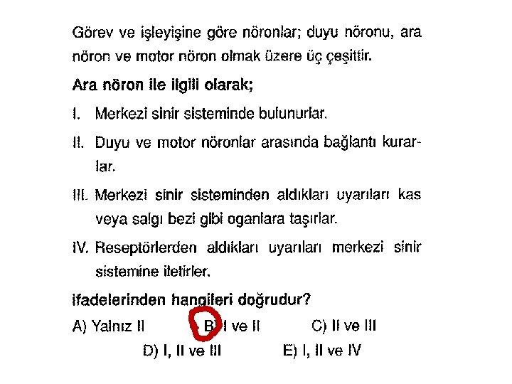 B) ARA BEYİN Ara beyin talamus, hipotalamus ve hipofizin arka lobu olmak üzere üç kısımda incelenir. a) Talamus Koku duyusu hariç beyin kabuğuna giden impulsların toplanıp gruplandığı bölgedir. Koku duyusu talamusa uğramadan beyin kabuğuna gider. Uyku halinde görev yapmaz. b) Hipotalamus Vücudun iç denge (homeostasi) merkezidir. • Su dengesinin ayarlanması • Karbonhidrat yağ mekanizmasının düzenlenmesi • Açlık tokluk, iştah hisleri • Heyecan, korku, öfke, kan basıncı durumlarının oluşması • Uyku düzeni • Vücut sıcaklığının dengede tutulması • Eşeysel olgunlaşma hipotalamusun başlıca görevleridir. Bu görevlerden bazılarını sinirsel olarak kontrol eder. Bazılarını salgıladığı RF (relasing faktör) hormonları ile hipofiz bezinin kontrolü ile dolaylı olarak yapar. c) Hipofizin Arka Lobu Hipotalamusun ürettiği hormonlar buradan salgılanır. ADH (suyun geri emilimini sağlar) ve Oksitosin (düz kasların kasılmasını sağlar) hormonları hipofizin arka lobundan salgılanır.