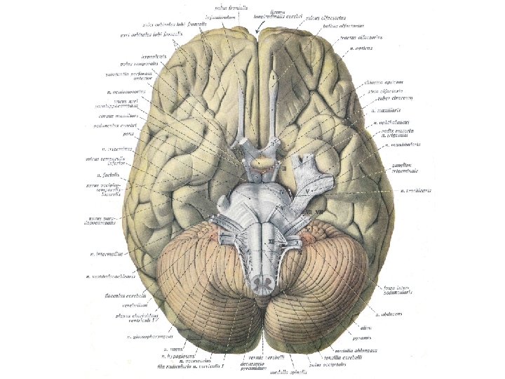 Nervi craniales (kafa çiftleri) Beyin santral sinir sisteminin, gelişmiş bölümüdür. Kafatasını oluşturan kemikler içindeki Cavitas crani’yi iyice doldurur. Alt yüzü ile Basis crani’ye oturmuştur. Beyinin alt yüzü Basis cerebri ismini alır. Basis cerebri’den 12 çift Nervi craniales (12 kafa çifti) çıkar.