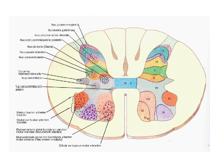 -Cornu ant. -- motor emri veren Somatomotor (Radicular), -Cornu post. --afferent duyuları alan Funicular -pars intermedia’nın dış tarafında 8. servikal-2. bel segmentleri arasında---sympathetic, -2 -4 sakral segmentler arasında --- parasempatik hücreler bulunur. Bu hücreler arasında iç hücreler bulunur.