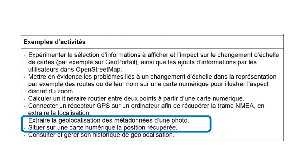 SNT Activité possible avec les élèves Avec leur téléphone – Lire les EXIF à l’aide de leur smartphone – Paramétrer leur téléphone pour activer/désactiver la géolocalisation de leur photo – Supprimer / Modifier les informations de géolocalisation Avec un ordinateur – Lire les EXIF – Les supprimer En débranché – Chercher ce que sont les EXIF – Lancer une réflexion/débat sur les avantages et les inconvénients de la géolocalisation
