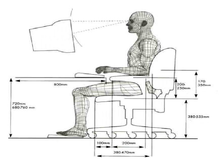 Staţia de lucru O staţie de lucru corect proiectată din punct de vedere ergonomic este una care permite profesorului, operatorului sau elevului să păstreze o poziţie naturală, liberă de orice unghiuri ori poziţii incomode. Ideal, persoana ar trebui să ţină picioarele pe podea sau pe un suport, coapsele paralele cu podeaua, spatele rezemat de spătarul scaunului, uşor aplecat înainte, capul şi gâtul drepte, coatele relaxate paralele cu corpul, încheieturile şi antebraţele paralele cu podeaua.