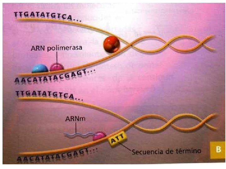 • 3. - Terminación: La ARN polimerasa reconoce una secuencia de término la transcripción que son : ATT, ACT, ATC. Como resultado se obtiene una hebra de ARNm que contiene la información del ADN que sirvió de molde.