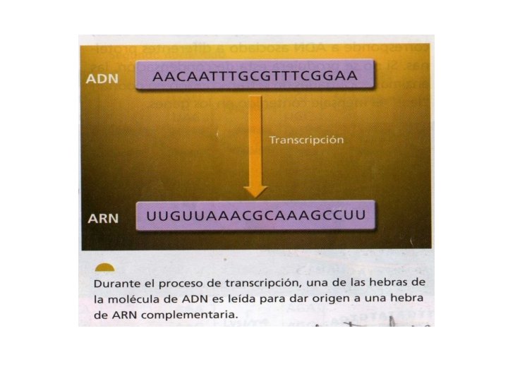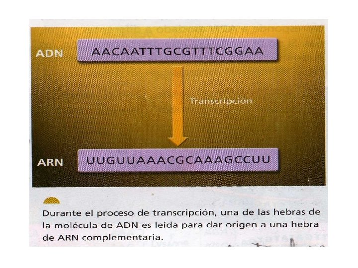 Transcripción • Es la síntesis de ARN a partir de un gen del ADN que actúa como molde. • El ADN es copiado por el ARNm.
