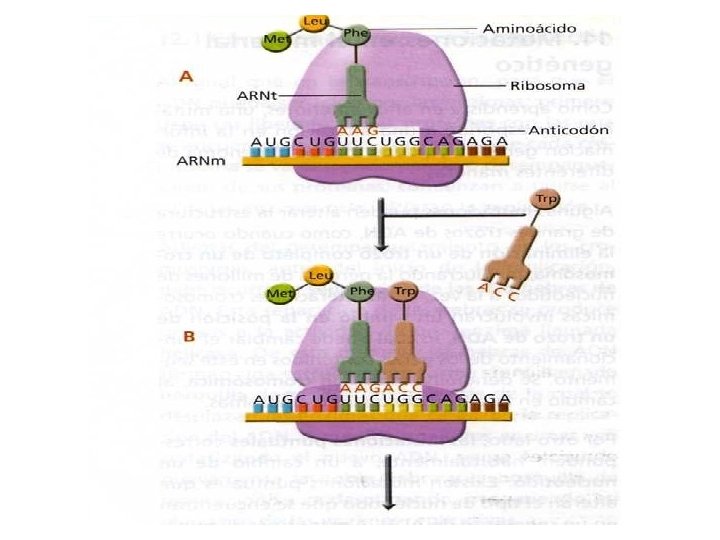 Elongación • Luego un segundo ARNt se ubica en el sitio A y el anticodón se acopla al codón del ARNm. • Se forma un enlace peptídico arriba entre los 2 primeros aminoácidos. Se rompe el enlace entre el primer aminoácido y su ARNt. El sitio P queda liberado.