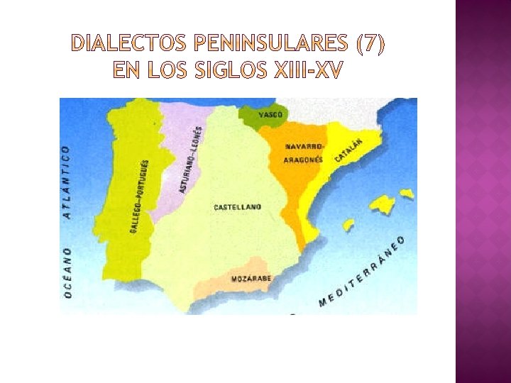 � CASTELLANO (se sobrepone a los demás) � gallego – portugués � austuriano – leonés � navarro – aragonés � catalán � mozárabe (dialecto de los hispanos bajo dominio árabe) � vascuense (se mantiene hoy día)