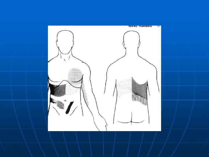 Dolor pleurítico n n Pleurítico aumenta al distender la hoja parietal, disminuye con la inmovilización de la zona (decúbito lateral sobre la zona enferma, fijan el hemitórax con esparadrapo) Pleuritis diafragmática dolor agudo al inspirar y toser, produce un dolor toracoabdominal referido a cuello por nervio frénico (segmentos cervicales CIIICV)
