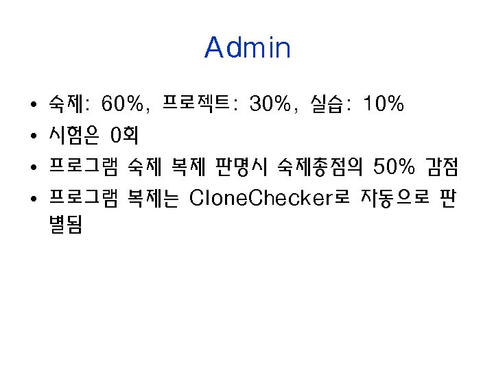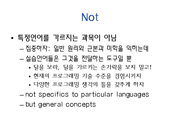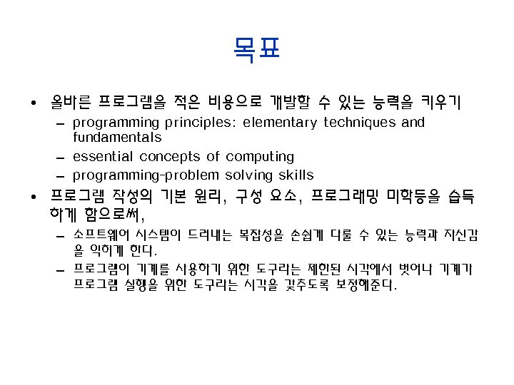 Computer Programming • 주로, 프로그램 = 컴퓨터를 돌리기 위한 도구 – how to make machines useful – how to talk to machines – how to run machines • 더불어 이제는, 컴퓨터 = 프로그램을 돌리기 위한 도구 – – – – programming moves to higher- and higher-level how to control complexity how to abstract complexity how to think in/for programming how to write correct programs how to prove programs correct how to write understandable programs