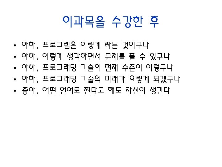 실습언어의 선택: Scheme + ML • simple and tiny language – focus on learning programming principles – focus on learning computing concepts – focus on learning big problem-solving skills • powerful and realistic language – can learn almost all programming fundamentals • automatic tool for typeful programming • 생소한 실습언어 = 복음 – 프로그래밍 경험이 많다고 유리하지 않음 – 프로그래밍 경험이 없다고 불리하지 않음 – 모두 같은 선에서 출발한다: 맘껏 능력을 발휘하자