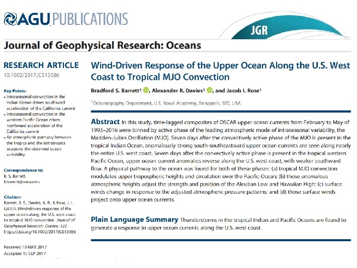 Summary Results • Ocean current anomalies were found for all eight MJO phases. • Time-lagged anomalies after active convection in two MJO regions, the Indian Ocean and western Pacific Ocean, showed greatest magnitude and the largest spatially coherent regions, particularly in the meridional direction. • Furthermore, those ocean anomalies were strongly supported by atmospheric anomalies, with a defined pathway from the tropical atmosphere to the extratropical ocean. • Those height anomalies adjust the position and strength of the two major atmospheric surface pressure features in the Pacific Ocean, the Aleutian Low and Hawaiian High. That adjustment in surface atmospheric pressures projects onto surface winds, and the winds then modify the upper ocean, resulting in the anomalies observed in OSCAR current data. • All of these results lend confidence to the conclusion that the MJO does project onto the upper ocean along the U. S. west coast on the intraseasonal time scale, particularly after tropical convection in the Indian Ocean and western Pacific Ocean.