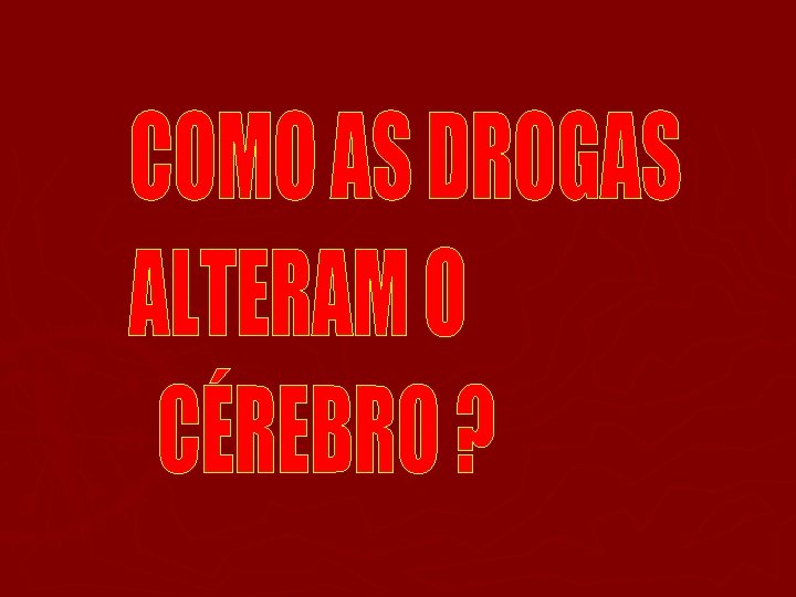 L O CO • ÁL EFEITOS NO CÉREBRO É UMA DROGA DEPRESSIVA, E CAUSA DEPENDÊNCIA. (SUA VENDA E FORNECIMENTO É PROIBIDA PARA MENORES DE 18 ANOS) Produz alterações a curto e a longo prazo nas funções cerebrais. EFEITOS A CURTO PRAZO Perda de coordenação, julgamento prejudicado, violência, acidentes, ressaca, fala arrastada, euforia e depressão. EFEITOS A LONGO PRAZO Problemas de memória, fígado, coração, úlceras, alteração na personalidade, lesão cerebral permanente e morte