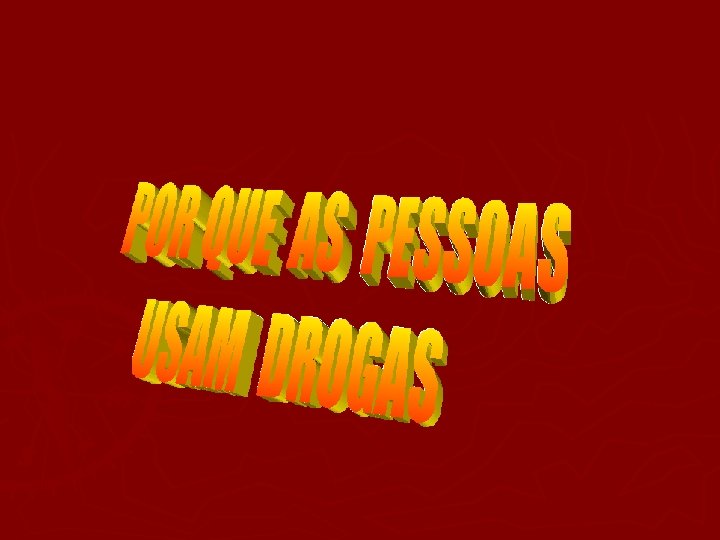 Motivos do Uso Fatores pscicológicos, hereditários, familiares e sociais Infelizes; ► Insegurança; ► Baixa Auto-estima; ► Pressão Social; ► Violência Doméstica; ► Pais que Tomam Drogas; ► Abandono; ► Fácil Acesso às Drogas; ► Tolerância Social; ► Negligência da Lei. ►