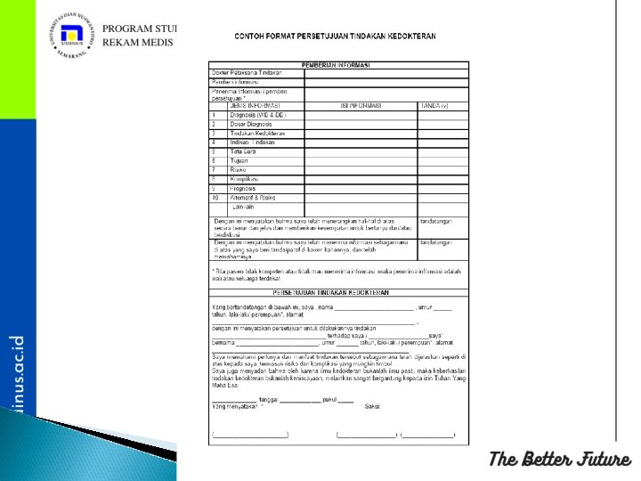 ISI INFORMASI �UNTUK SETIAP PILIHAN TINDAKAN (Keuntungan, risk, %Keberhasilan �Nyatakan bila upaya rencana terapi adalah upaya yang masih eksperimental �Bagaimana dan kapan kondisi pasien dan efek samping akan dimonitor dan dinilai kembali �Nama dokter yang bertanggung jawab/tim