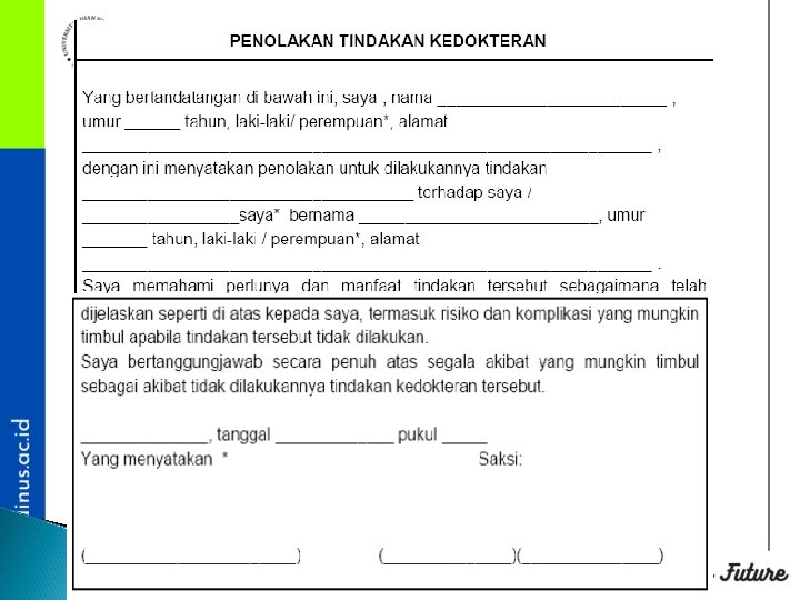 Referensi : �Theaching Health Ethics : WHO South Easth Asia Region �National Cancer Institute. A Guide to Understanding Informed Consent. Available at: wwww. cancer. gov/Clinical. Trials �Buku Manual Persetujuan Tindakan Kedokteran : Konsil Kedokteran Indonesia 2006