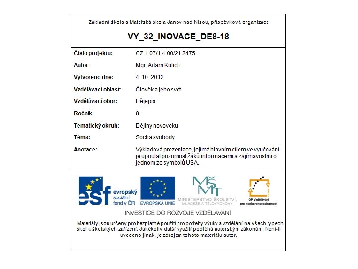 Metodika materiálu: - prezentace, seznamující žáky s historií patrně nejslavnější sochy na světě - na tuto prezentaci může navazovat samostatná práce žáků s vybraným zdrojem informací – hledání zajímavostí a dalších faktů apod. Zdroje: NORDWEST. USA location map. svg [online]. [cit. 4. 10. 2012]. Dostupný na WWW: <http: //upload. wikimedia. org/wikipedia/commons/3/33/USA_location_map. svg>. G 36. Estatua de la libertad. JPG [online]. [cit. 4. 10. 2012]. Dostupný na WWW: <pload. wikimedia. org/wikipedia/commons/2/26/Estatua_de_la_libertad. JPG>. NEZNÁMÝ. Liberte. Exposition. Universelle. Paris 1878. jpg [online]. [cit. 4. 10. 2012]. Dostupný na WWW: <http: //upload. wikimedia. org/wikipedia/commons/b/bb/Liberte. Exposition. Universelle. Paris 1878. jpg>. JENSEN, Derek. Statue-of-liberty tysto. jpg [online]. [cit. 4. 10. 2012]. Dostupný na WWW: <http: //upload. wikimedia. org/wikipedia/commons/2/2 c/Statue-of-liberty_tysto. jpg>. SARONY, Napoleon. Frederic Auguste Bartholdi. jpg [online]. [cit. 4. 10. 2012]. Dostupný na WWW: <http: //upload. wikimedia. org/wikipedia/commons/c/c 8/Frederic_Auguste_Bartholdi. jpg>. NADAR. Gustave Eiffel 1888 Nadar. jpg [online]. [cit. 4. 10. 2012]. Dostupný na WWW: <http: //upload. wikimedia. org/wikipedia/commons/3/38/Gustave_Eiffel_1888_Nadar. jpg>. NEZNÁMÝ. Rahmen. Statue 1885. jpg [online]. [cit. 4. 10. 2012]. Dostupný na WWW: <http: //upload. wikimedia. org/wikipedia/commons/d/d 7/Rahmen. Statue 1885. jpg>. NEZNÁMÝ. Construction of the Statue 1. jpg [online]. [cit. 4. 10. 2012]. Dostupný na WWW: <http: //upload. wikimedia. org/wikipedia/commons/0/03/Construction_of_the_Statue 1. jpg>. SCHWEN, Daniel. Statue of Liberty interior. jpg [online]. [cit. 4. 10. 2012]. Dostupný na WWW: <http: //upload. wikimedia. org/wikipedia/commons/a/ac/Statue_of_Liberty_interior. jpg>. NATIONAL PARK SERVICE. Soltorch. jpg [online]. [cit. 4. 10. 2012]. Dostupný na WWW: <http: //upload. wikimedia. org/wikipedia/commons/9/9 f/Soltorch. jpg>. HEDINGTON, Will. Statueliberty. JPG [online]. [cit. 4. 10. 2012]. Dostupný na WWW: <http: //upload. wikimedia. org/wikipedia/commons/4/4 e/Statueliberty. JPG>. GREUDIN. Paris-ile-des-cygnes-statue-de-la-liberte-tour-eiffel-seine. jpg [online]. [cit. 4. 10. 2012]. Dostupný na WWW: <http: //upload. wikimedia. org/wikipedia/commons/1/16/Paris-ile-des-cygnes-statue-de-la-liberte-tour-eiffel-seine. jpg>. Ostatní obrázky jsou součástí knihoven Microsoft Office 2007