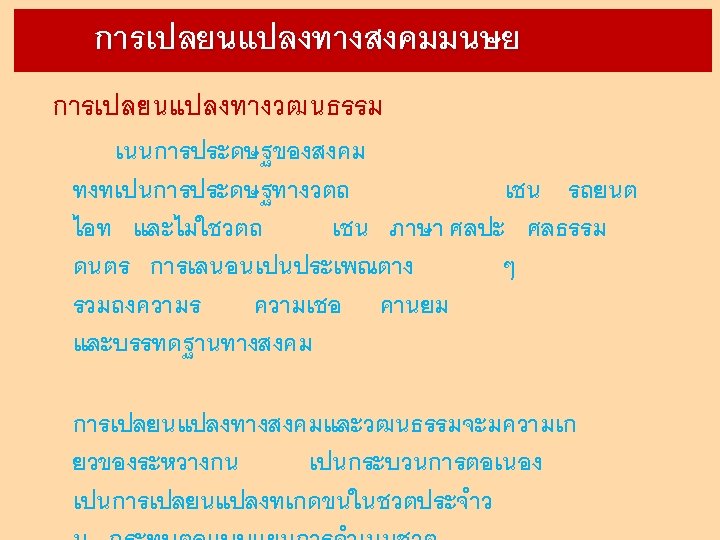 Types of Social Change )รปแบบของการเปลยนแปลงทางสงคม Cultural Change • literature • religion Civilization Change • dress • Foods habits Change in Social Relationship • Husband wife • Teacher and student (