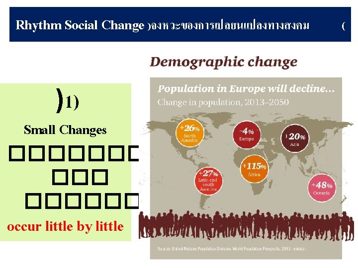 Rhythm Social Change )จงหวะของการเปลยนแปลงทางสงคม )3 ) Change due to a crisis situation �������� � If small cumulative changes bring about problems which are not solved right away (