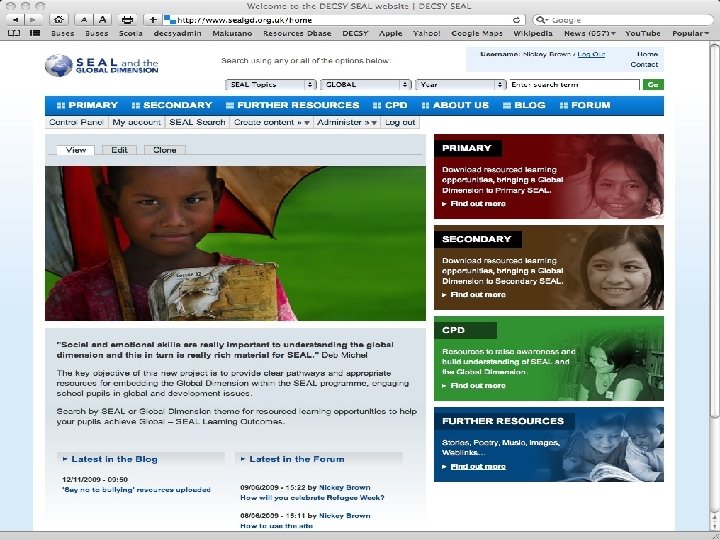 Why SEAL and the Global Dimension? “The problem is that no clear link has yet been made between the Global Dimensions approach and the SEAL materials. This constitutes a lost opportunity for joined-up thinking amongst different government departments. While SEAL has very little material of a global nature amongst its resources, similarly Global Dimensions does not specifically aim to encourage social and emotional learning through the resources that it features. The two could bring a lot of synergy if combined well. ” You Are Therefore I Am: How Empathy Education Can Create Social Change , Roman Krznaric Oxfam 2008 “The global dimension is the missing element of SEAL” Deb Michel (former SEAL National Strategy lead & member of DECSY National Consultancy Group)