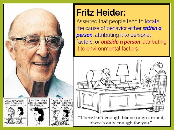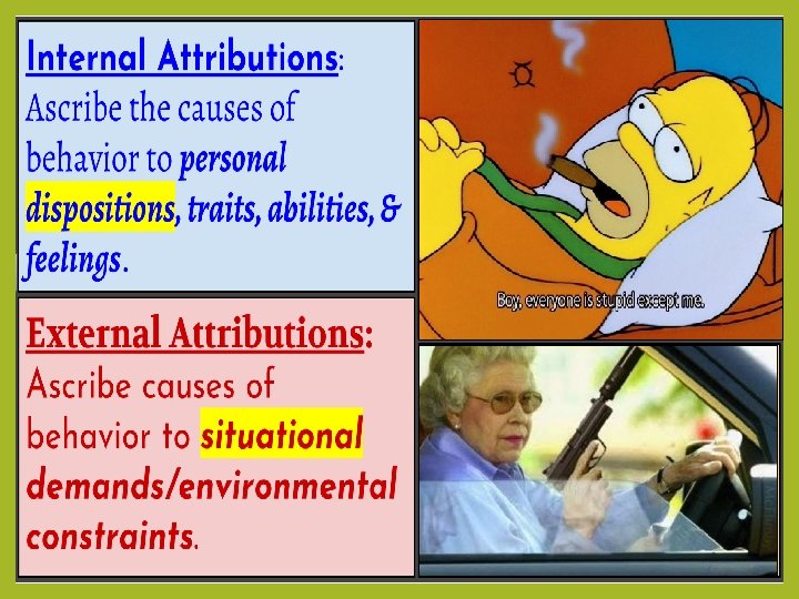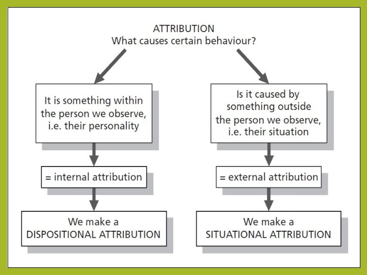 ATTRIBUTION Make guesses, or “attributions, ” THEORY about the causes of their behavior. We often make mistakes because of the bias. 1. Fundamental Attribution Error (FAE): Suggests that we tend to make attributions about causes of behavior being internal & not external. Personal - not situational. We often believe that someone does something because of who they are, not because of the situation.
