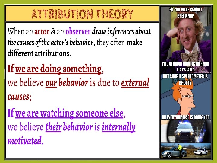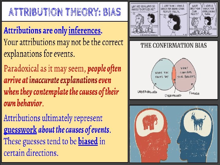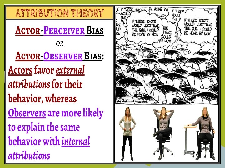 ATTRIBUTION THEORY 2. Actor-Perceiver Bias: If we are doing something, we believe our behavior is due to external causes. • If we are watching someone else, we believe their behavior is internally motivated.