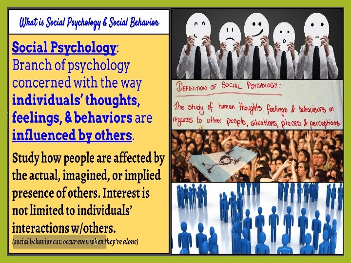 Definition Social Psychology: Is the study of how we think about, influence, and relate to one another. Social psychologists deal with…. • The factors that lead us to behave in a given way in the presence of others, and look at the conditions under which certain behavior/actions and feelings occur. • The way these feelings, thoughts, beliefs, intentions and goals are constructed and how such psychological factors, in turn, influence our interactions with others. First Experiment: 1988 Experiment to investigate the performance of cyclists and schoolchildren on how the presence of others influences overall performance – thus how individual’s are affected and behave in the social context.