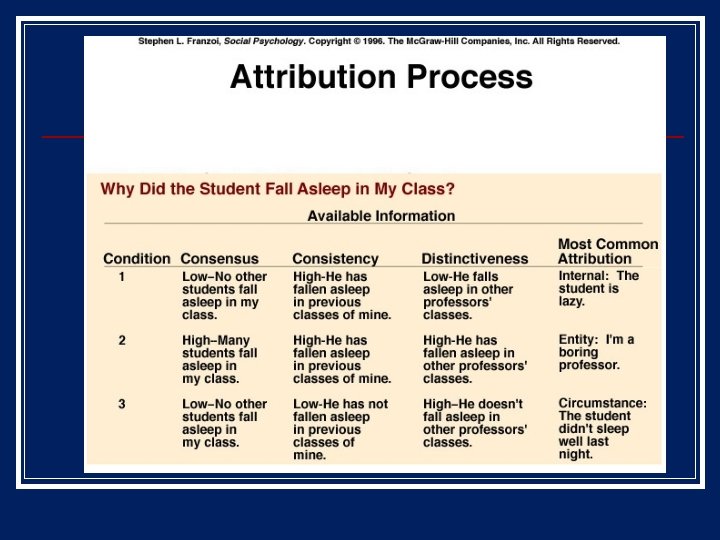 Commonsense Attribution n Harold Kelley’s Theory of Attribution: n Consistency n n Distinctiveness n n Does this usually happen? Does the person behave differently in different situations? Consensus n Do others behave similarly?
