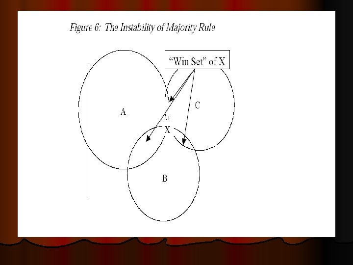 Choices: War in Iraq Here is the problem: I/P Rummy N W W P P N Prud Dove P Best N Middle W Worst Majority preferences: W > P > N > W Endless, infinite cycling over alternatives. Not a tie, but a literal perpetual motion machine