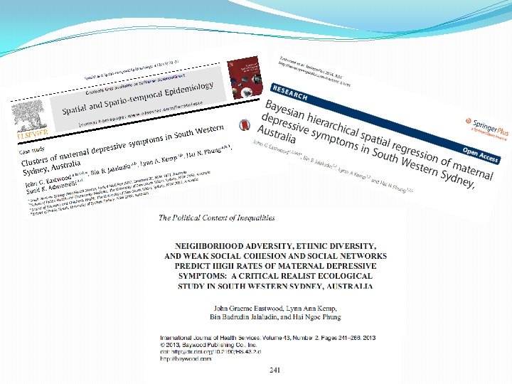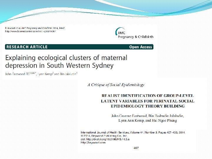 Methodology and Methods �We used a critical realist approach to social epidemiology theory building. �Emergent methods included: key informant interviews, focus groups, thematic analysis, conceptual mapping, situational analysis, factor analysis, logistic, linear, and Bayesian spatial and multilevel regression studies. �Explanatory theory building utilised abductive Inference to the Best Explanation.