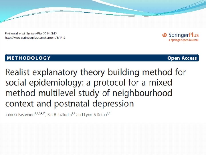 Conclusion �Drawing on the call for theory building approaches to social epidemiology I have utilised critical realism and a mixed method design to construct an explanatory theory of maternal depression and context. �The study will contribute to the increasing role that both realism and mixed methods are playing in explaining the social distribution and social determinants of health.