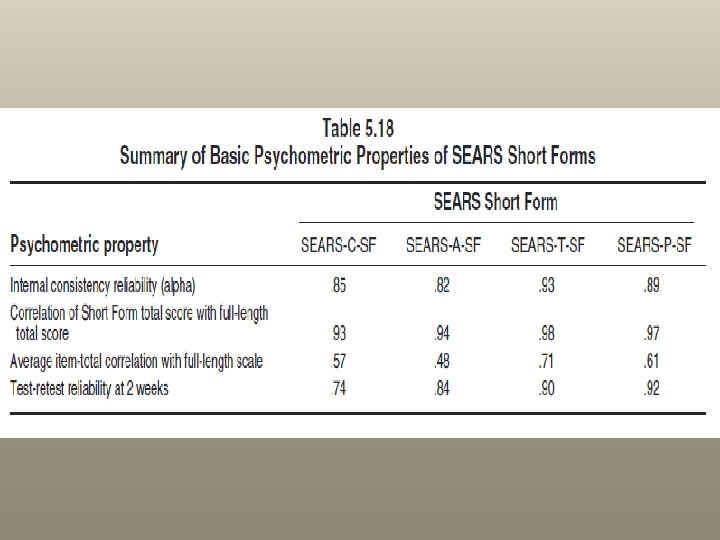 Reliability SEARS-C Total Score . 92. 85 Short Form SEARS-A Self-Regulation . 84. 85 Social Competence Empathy Responsibility Total Score Short Form . 85. 80. 93. 82
