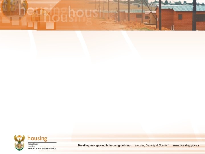 Proposed Rental strategy Community Residential Units • Correcting historical problems with public housing & hostels • Coherent framework for public housing & hostels • Indigent & lower income groups (R 3500 – R 800) • Stabilizing market & housing environ • Addressing slum landlords • Affordable formal accom for informal tenants • Object subsidy Social housing • Private sector for-profit & non-profit sectors mobilized • Cross-subsidization • Mobilizing private funders • Restructuring objectives • Lower and middle income groups (R 7500 – R 1500) • Object subsidy