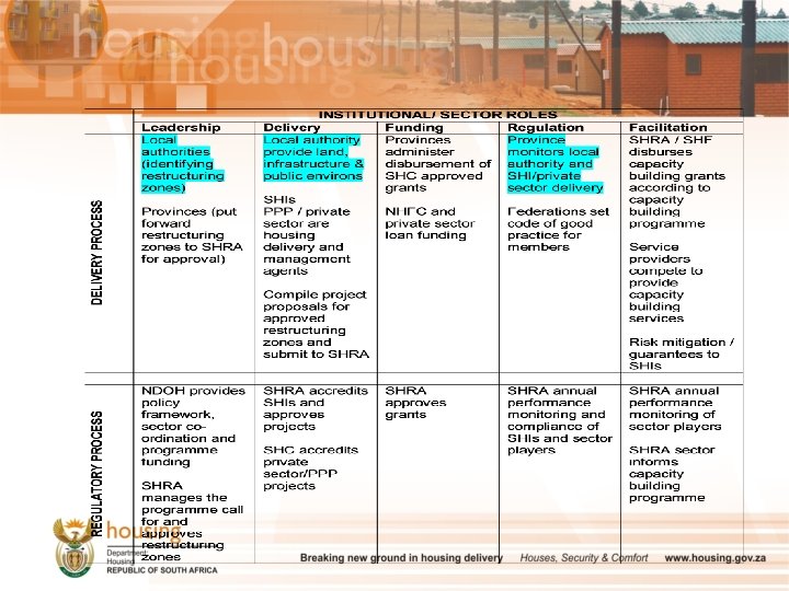 Chapter 5 • Regulations to the bill – Code of conduct – Investment criteria & qualifying criteria – SHRA & other delivery agents – SHRA & provinces – SHRA & NHFC – Administrative matter