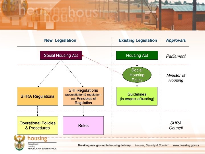 Social Housing Bill, 29 of 1997 Chapter 1 Social Housing Bill 29 of 1997 Terminology & principles Programme & Regulations Chapter 4 Chapter 2 Roles & Responsibilities Chapter 5 Chapter 3 SHRA establishment SHI functioning & Accreditation