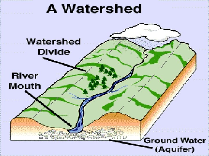 Water shed management v watershed is a basin like landform defined by peaks which are connected by ridges that descend into lower elevations and small valleys. v It carries rainwater falling on it drop by drop and channels it into soil and streams flowing into large rivers. v It involves management of land, water, energy and greenery integrating all the relevant approaches appropriate to socioeconomic background for a pragmatic development of a watershed.