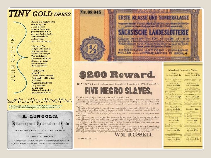 Some of the kinds of information that were passed on by ephemera were political views, reward notices - not just for runaway persons, but runaway pets as well, antislavery and civil war propaganda, education and health information, labour concerns, and on a lighter side poetry and verse.