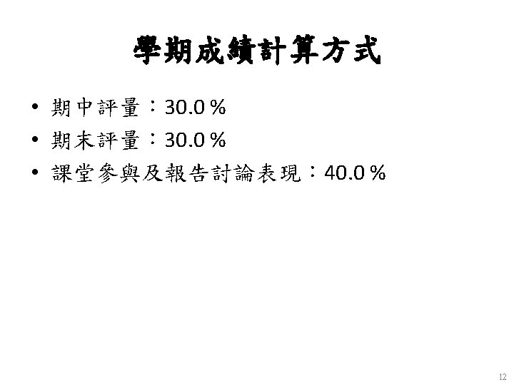 教材課本與參考書籍 • 參考書籍 (References) – The Social Media Management Handbook, Robert Wollan, Nick Smith, Catherine Zhou, John Wiley, 2011. – The Social Media Bible: Tactics, Tools, and Strategies for Business Success, Lon Safko, Wiley, 2012 – The Complete Social Media Community Manager's Guide: Essential Tools and Tactics for Business Success, Marty Weintraub and Lauren Litwinka, Sybex, 2013. – Data Science for Business: What you need to know about data mining and data-analytic thinking, Foster Provost and Tom Fawcett, O'Reilly, 2013 11