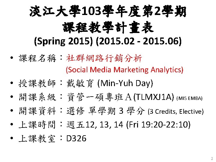 Social Media Marketing Analytics Tamkang University 社群網路行銷分析 Course Orientation for Social Media Marketing Analytics (社群網路行銷分析課程介紹) 1032 SMMA 01 TLMXJ 1 A (MIS EMBA) Fri 12, 13, 14 (19: 20 -22: 10) D 326 Min-Yuh Day 戴敏育 Assistant Professor 專任助理教授 Dept. of Information Management, Tamkang University 淡江大學 資訊管理學系 http: //mail. tku. edu. tw/myday/ 2015 -03 -06 1