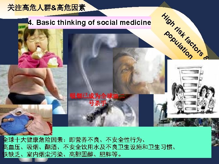 社会医学的核心内容 Core Contents l Diagnosis of social medicine--identify problems ---- 社会医学诊断 l Analysis of social cause of disease —social etiology ----- 社会病因分析 l Social medicine prescription social strategy ----- 社会医学处方