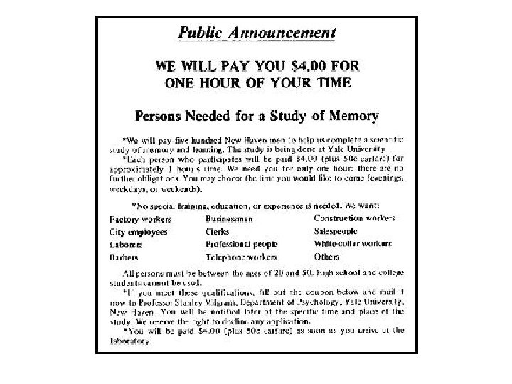 Obedience • Teacher told to give increasingly intense shocks – 15 volt increments • • 15 -60 v 75 -120 v 135 -180 v 195 -240 v 255 -300 v 315 -360 v 375 -420 v 435 -450 v “slight” “moderate” “strong” “very strong” “intense” “extremely intense” “danger-severe shock” “XXX” • Each time the learner gave wrong answer the next switch was to be flipped. • NO ONE WAS ACTUALLY SHOCKED! – Except sample 45 volt shock