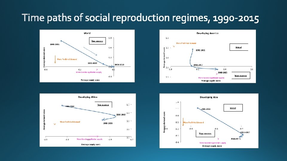 Time squeeze Higher wages for women are good for growth, but more market participation squeezes time and lowers human capacities production. Growth is elusive or unstable. Social reproduction regimes, 2008 -2015 Wage-led/ altruistic Higher wages for women are good for growth, and more market participation enhances human capacities production. Growth and social reproduction reinforce one another. High-road/ gender egalitarian Low-road/ FRO Exploitation Higher wages for women lower growth, and more market participation squeezes time and lowers human capacities production. Growth is partly based on exploiting women’s labor and human resources. Mutual Wage squeeze Higher wages for women lower growth, but more market participation enhances human capacities production. Growth is elusive or unstable. Profit-led/ individualistic