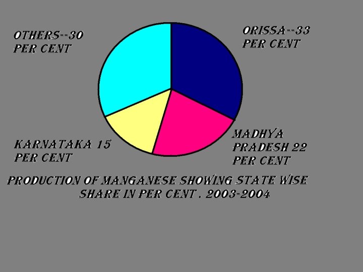 MAGANESE o Manganese is mainly used in the manufacturing of steel & Ferro- manganese alloy. o Nearly 10 kg of manganese is required to manufacture one tone of steel. o It is also used in manufacturing bleaching powder , insecticides & paints. o ORISSA is the largest producer of manganese ores in India. o It accounted for one – third of the country’s total production in 2000 -01.